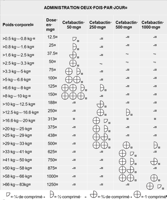 Le tableau suivant sert de guide à l’administration du produit à une dose de 15 mg de céfalexine par kg de poids corporel, deux fois par jour.