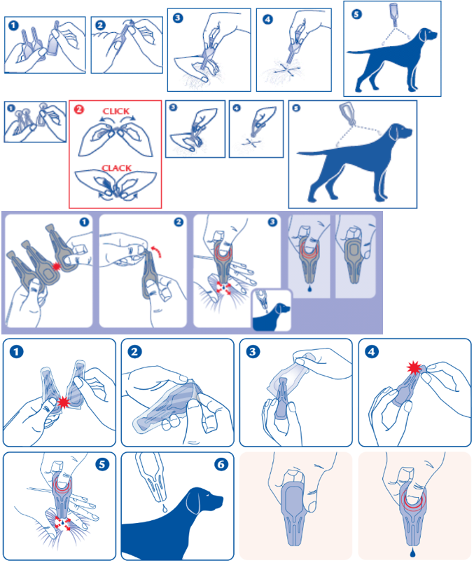Détacher une pipette et la tenir en position verticale. Donner de petits coups sur la partie étroite de la pipette pour s'assurer que le contenu est bien descendu dans la partie centrale de la pipette. Rompre l'extrémité autocassable de la pipette pour spot-on en suivant la ligne gravée.