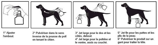 Pulvériser le produit sur les animaux à l'air libre ou dans une pièce bien aérée.