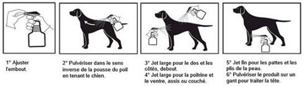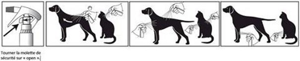 Pulvériser le médicament vétérinaire sur l'ensemble du pelage de l'animal à une distance de 10-20 cm environ. Appliquer dans le sens inverse de la pousse du poil en veillant à ce que l'ensemble du pelage de l'animal soit humidifié. Masser le pelage, en particulier chez les animaux à poils longs afin que le médicament vétérinaire pénètre jusqu'à la peau. Pour le traitement de la zone autour de la tête, ou pour traiter des animaux jeunes ou nerveux, l'application peut se faire en pulvérisant d'abord le médicament vétérinaire sur un gant et en frottant ensuite le gant sur le pelage. Laisser sécher à l'air libre. Ne pas utiliser une serviette pour sécher l'animal.