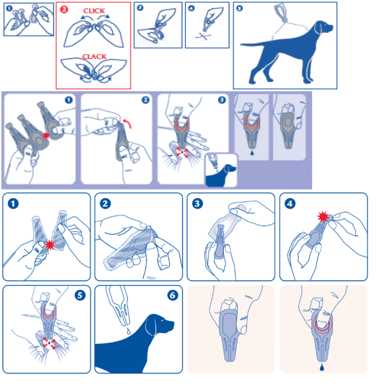 Le médicament vétérinaire n'empêche pas les tiques de s'accrocher aux animaux. Si l'animal a été traité avant qu'il ne soit exposé aux tiques, celles-ci seront tuées dans les premières 24-48 heures après qu'elles se soient accrochées. Dans la plupart des cas, elles seront mortes avant qu'elles ne se soient gorgées de sang, ce qui minimise mais n'exclut pas la transmission des maladies. Une fois que les tiques sont mortes, elles tombent de l'animal ; celles qui restent accrochées peuvent être enlevées en tirant doucement dessus.
