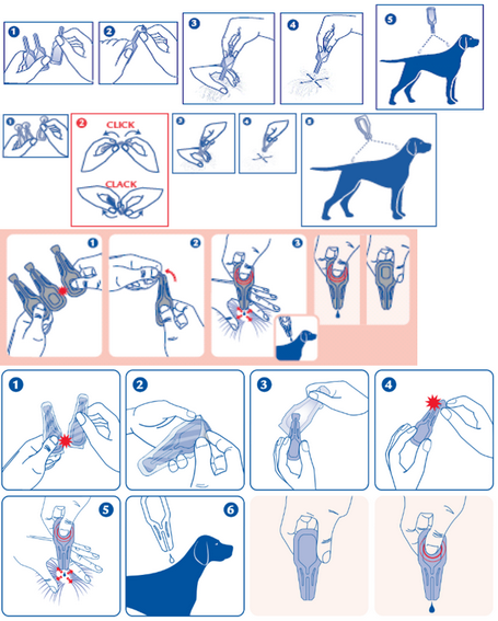 Détacher une pipette et la tenir en position verticale. Donner de petits coups sur la partie étroite de la pipette pour s'assurer que le contenu est bien descendu dans la partie centrale de la pipette. Rompre l'extrémité autocassable de la pipette pour spot-on en suivant la ligne gravée.