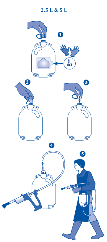 - Bidons blancs opaques en polyéthylène haute densité de 2,5 ou 5 litres avec un opercule amovible en aluminium, un bouchon polypropylène et un bouchon d’évent en polypropylène.